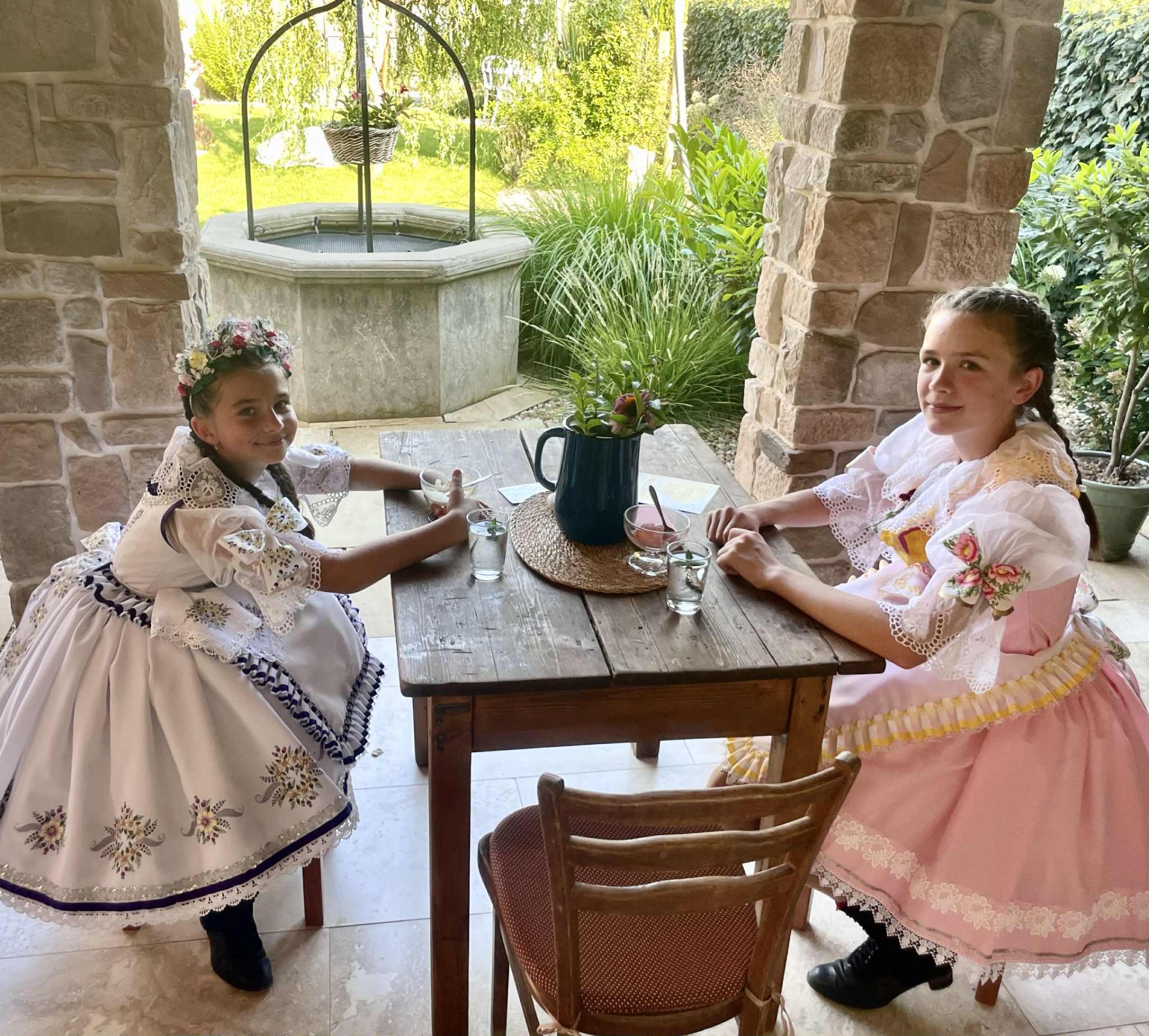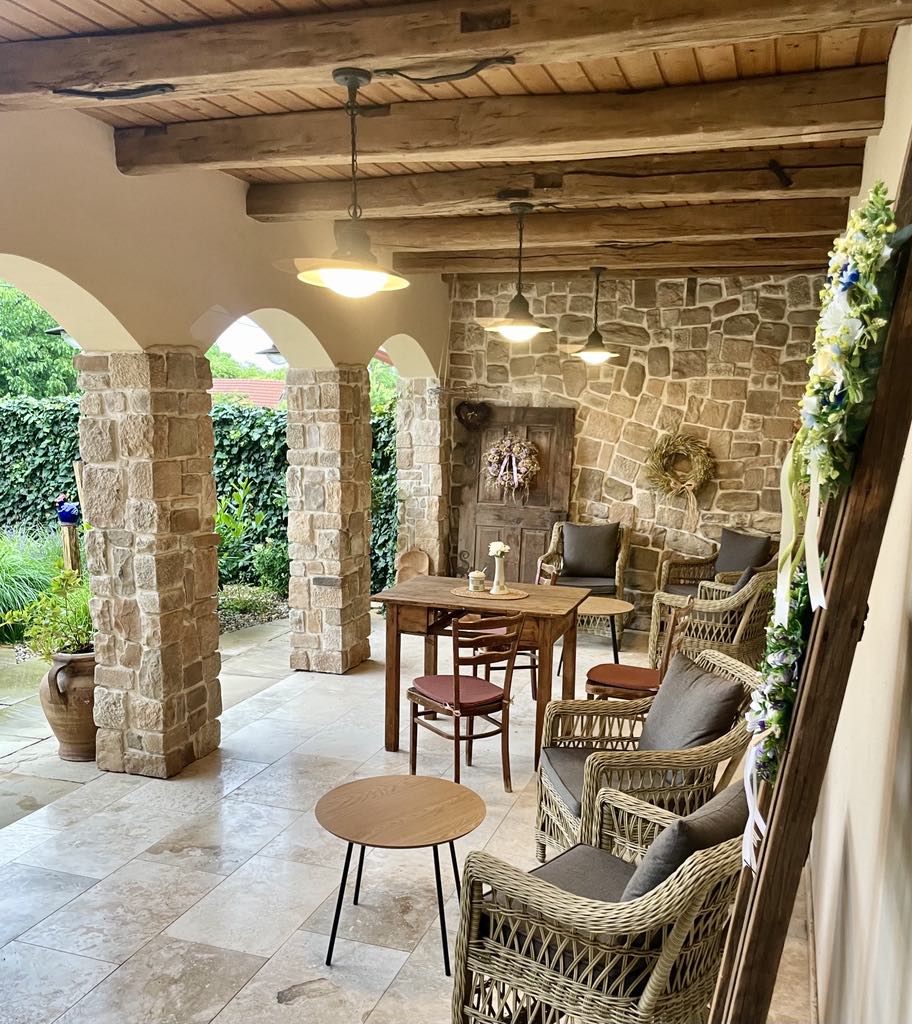 Posezení na zahradě i v podloubích nabízí klidné místo pro odpočinek a příjemnou venkovskou atmosféru.